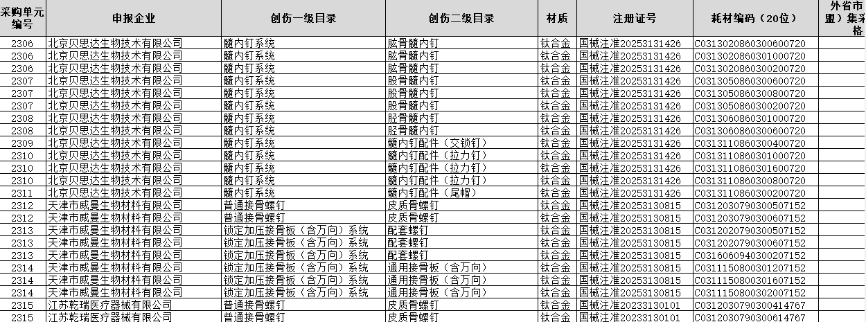 上海市骨科创伤类医用耗材集中带量采购2025年第四季度增补拟中选产品附件