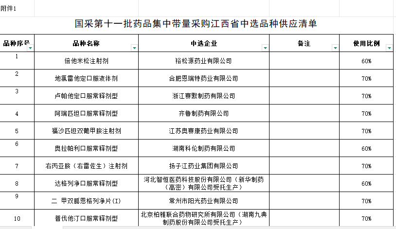国采第十一批药品集中带量采购江西省中选品种供应清单附件