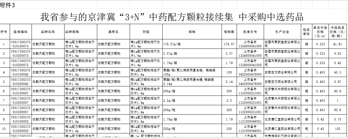 河南省参与的京津冀“3+N”中药配方颗粒接续集 中采购中选药品附件