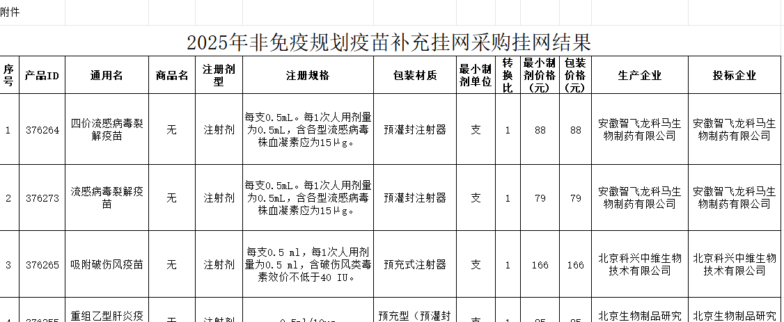 宁夏2025年非免疫规划疫苗补充挂网采购挂网结果附件