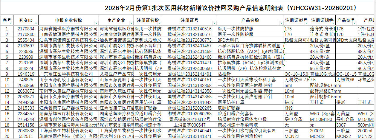 广东省2026年2月份第1批次医用耗材新增议价挂网采购产品信息明细表(YJHCGW31-20260201)附件