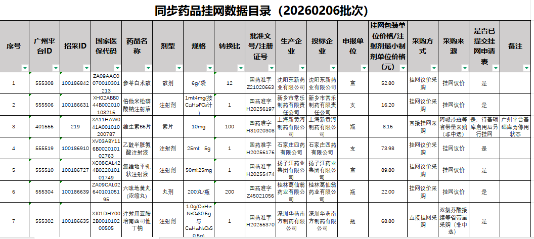 广东省广州市同步药品挂网数据目录(20260206批次附件