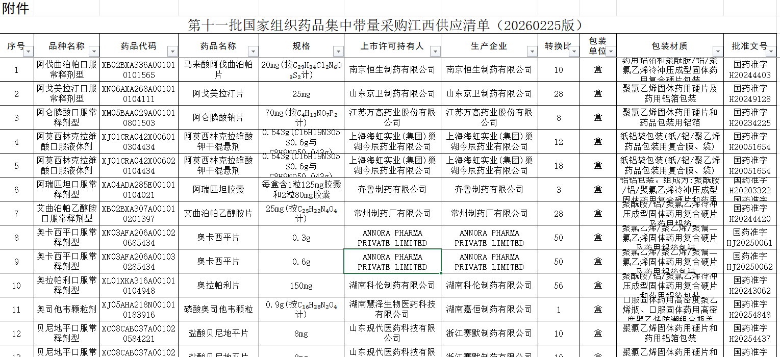 第十一批国家组织药品集中带量采购江西供应清单(20260225版)