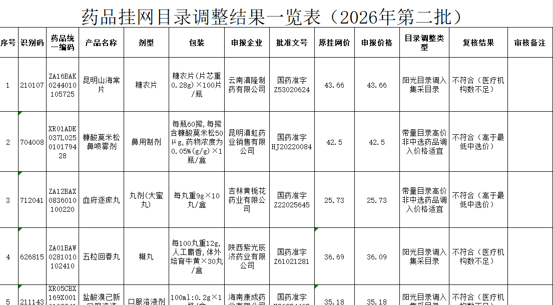 甘肃药品挂网目录调整结果一览表(2026年第二批)