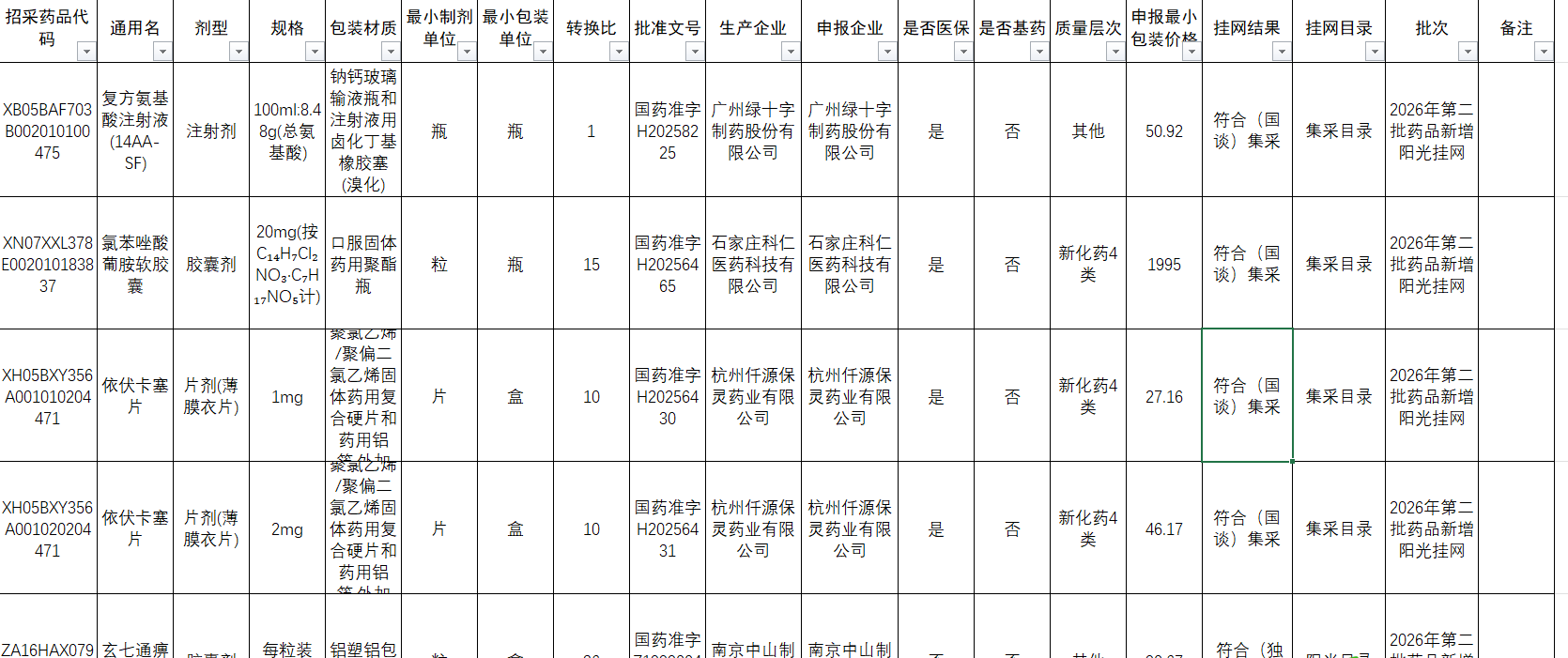 甘肃2026年第二批药品新增阳光挂网结果公布表