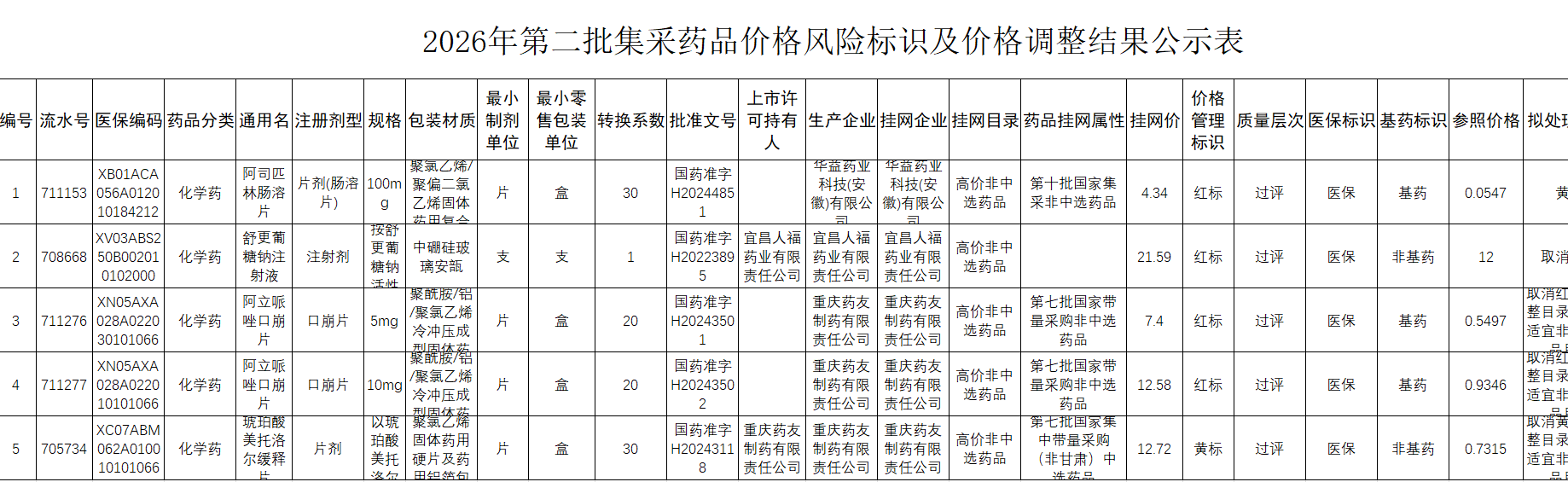 甘肃2026年第二批集采药品价格风险标识及价格调整结果公示表