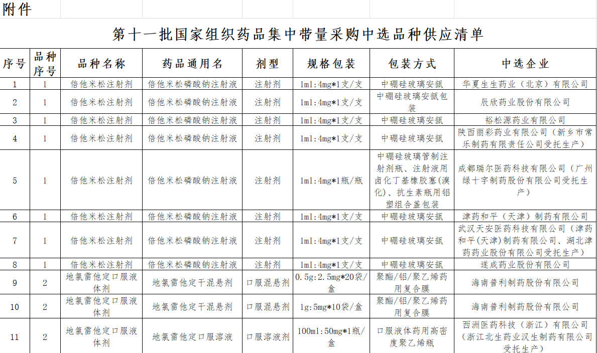 附件:第十一批国家组织药品集中带量采购中选药品供应清单