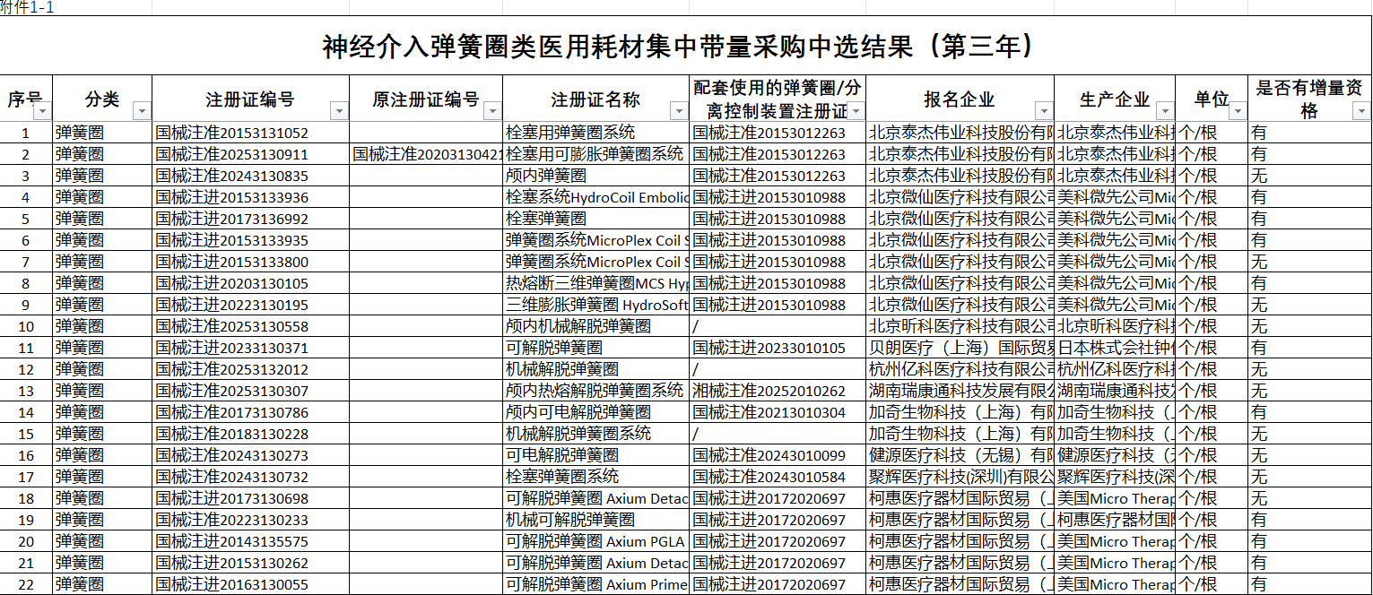 附件1:神经介入弹簧圈类医用耗材集中带量采购中选结果(第三年)