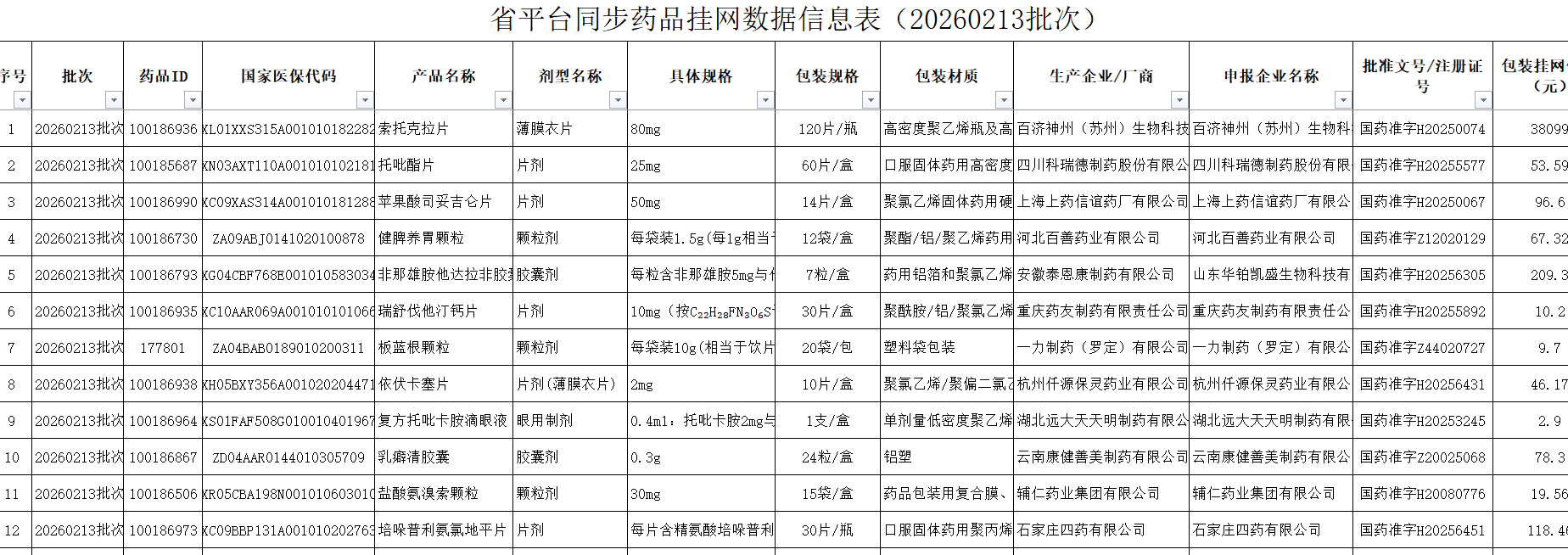 省平台同步药品挂网数据信息表(20260213批次)