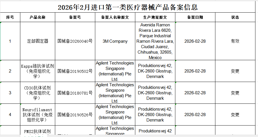 2026年2月进口第一类医疗器械产品备案信息