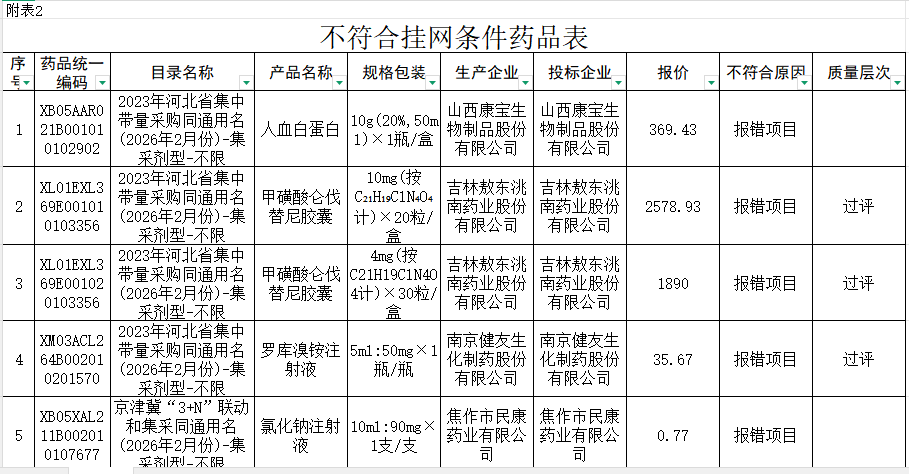 河北省不符合挂网条件药品表260303