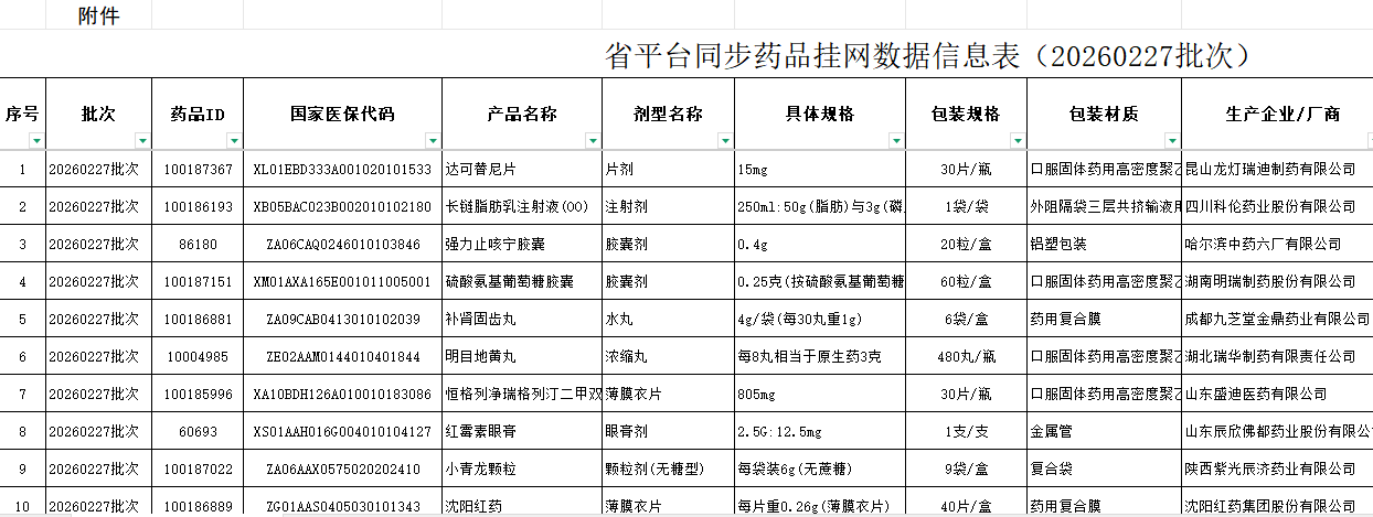 广东省平台同步药品挂网数据信息表(20260227批次)附件