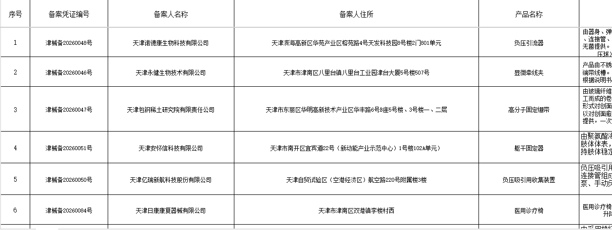 天津市第一类医疗器械产品备案公示(2026年第2期)