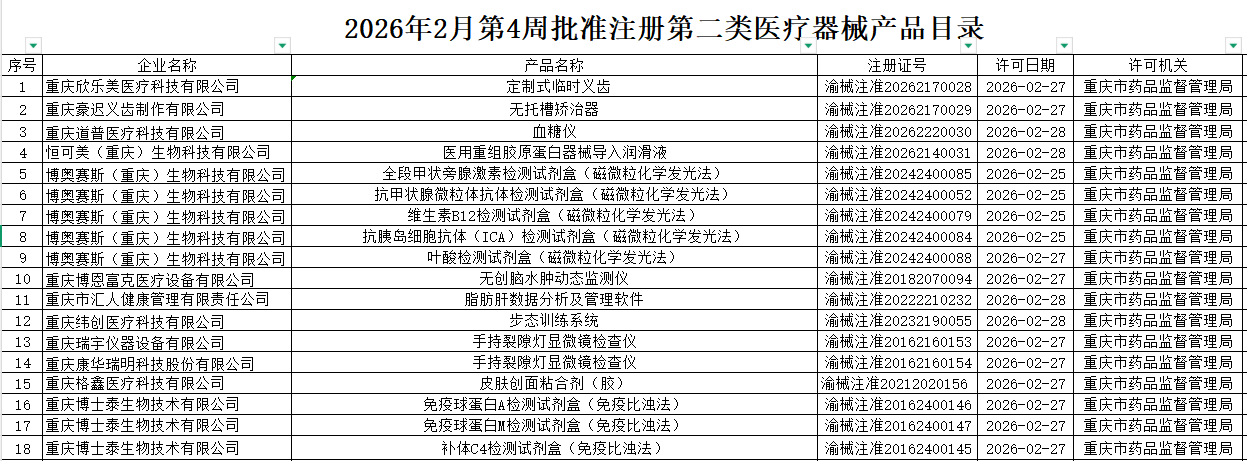 重庆市药品监督管理局2026年2月第4周批准注册第二类医疗器械产品目录附件