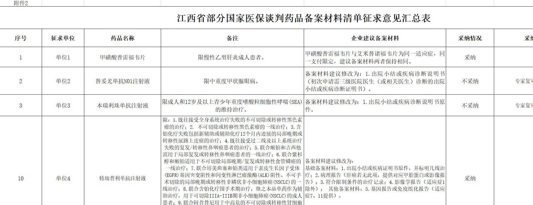 江西省部分国家医保谈判药品备案材料清单征求意见汇总表