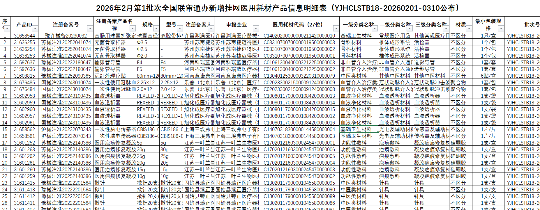 广东省2026年2月第1批次全国联审通办新增挂网医用耗材产品信息明细表(YJHCLSTB18-20260201-0310公布)