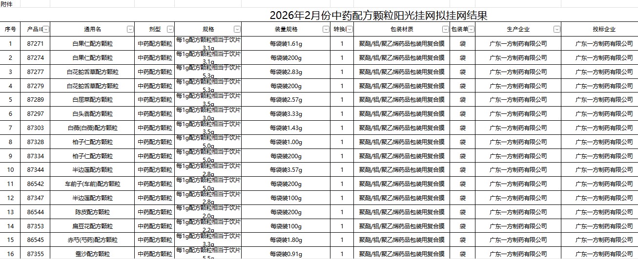 宁夏2026年2月份中药配方颗粒阳光挂网拟挂网结果