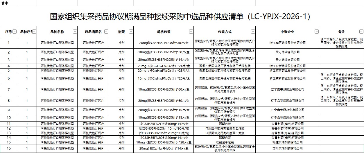 广东省国家组织集采药品协议期满品种接续采购中选品种供应清单(LC-YPJX-2026-1)