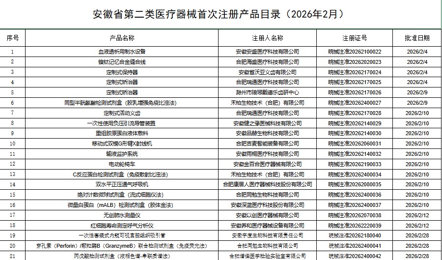 安徽省第二类医疗器械首次注册产品目录(2026年2月)