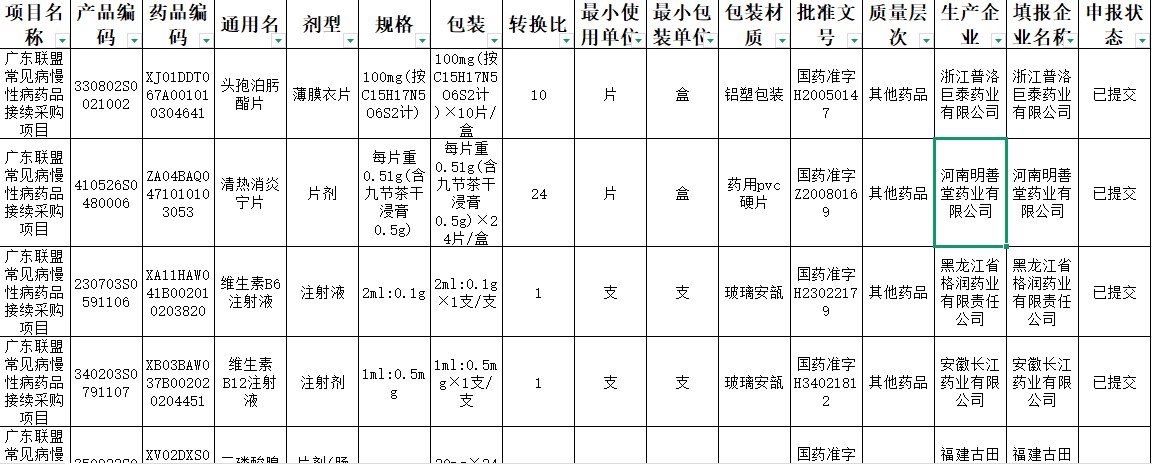 吉林省广东联盟常见病慢性病药品接续采购中选申报结果