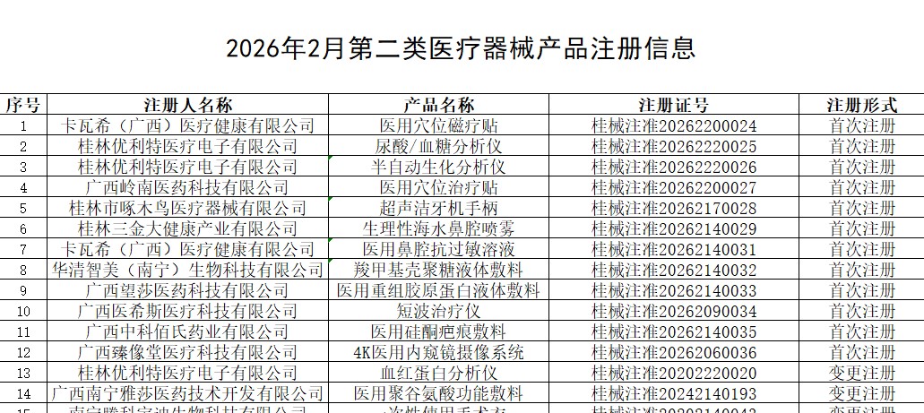 广西壮族自治区2026年2月第二类医疗器械产品注册信息表
