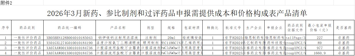 湖南省2026年3月新药、参比制剂和过评药品申报需提供成本和价格构成表产品清单