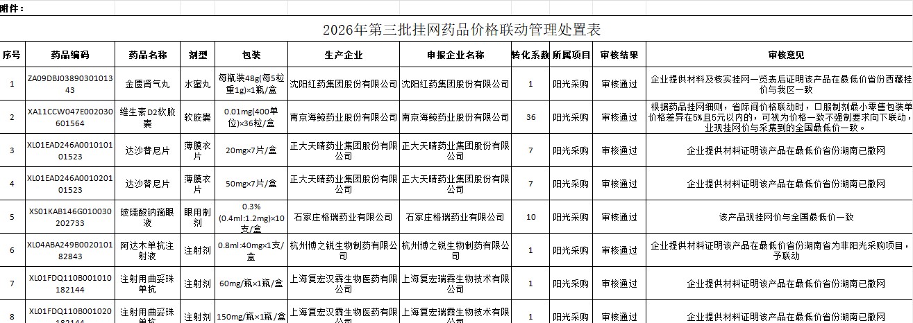 新疆维吾尔自治区2026年第三批挂网药品价格联动管理处置情况表