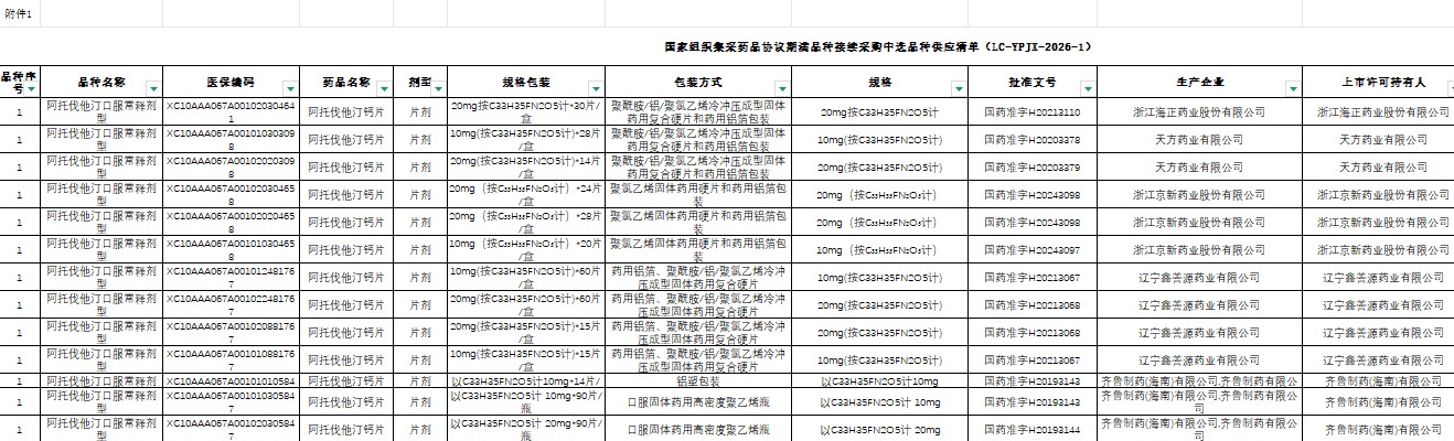 吉林省2026年国家组织集采药品协议期满品种接续采购中选品种供应清单