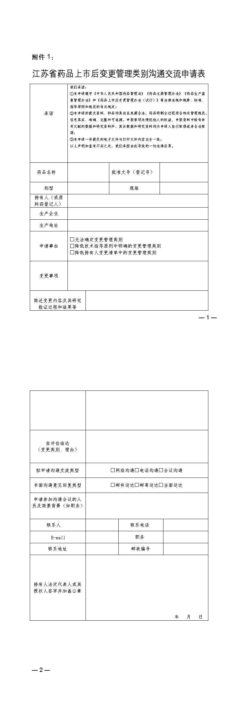 附件1:江苏省药品上市后变更管理类别沟通交流申请表