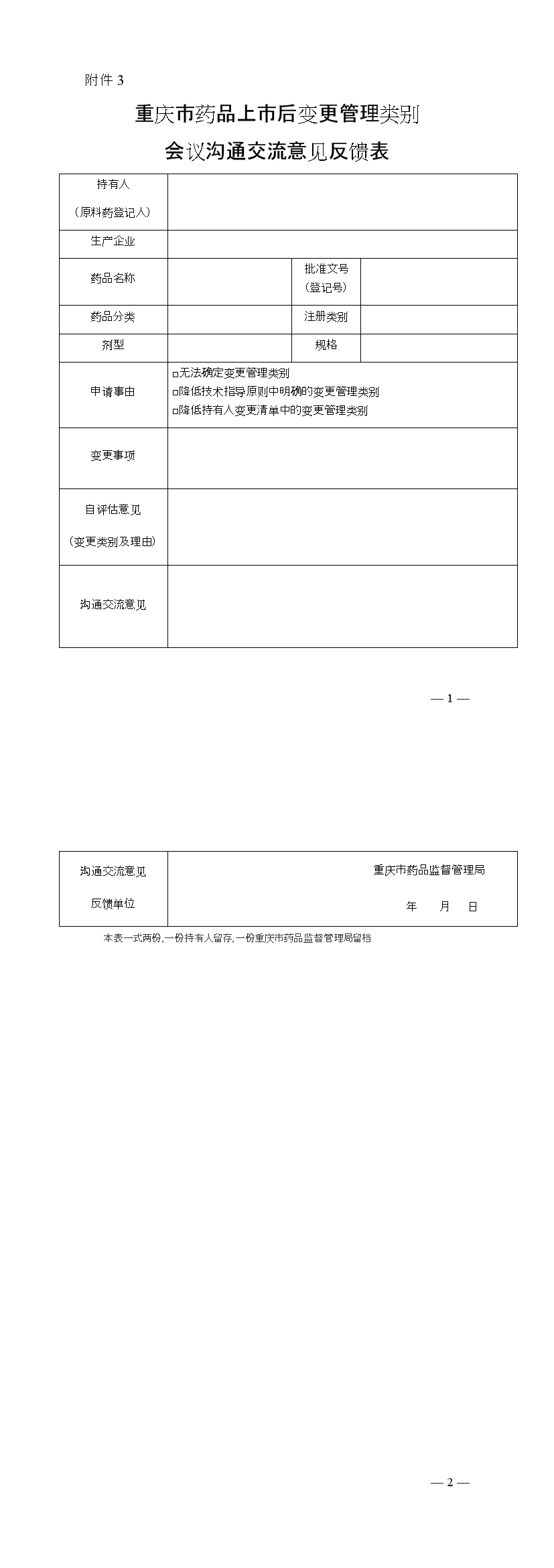 3.重庆市药品上市后变更管理类别会议沟通交流意见反馈表.docx