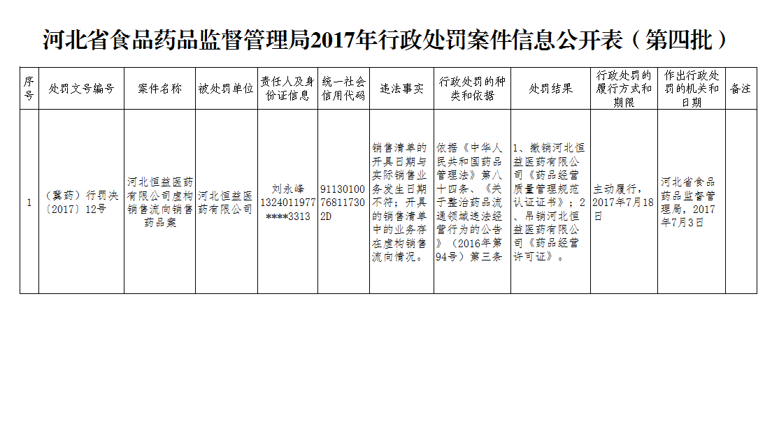 河北省食品药品监督管理局2017年行政案件处罚信息公开表(第四批)
