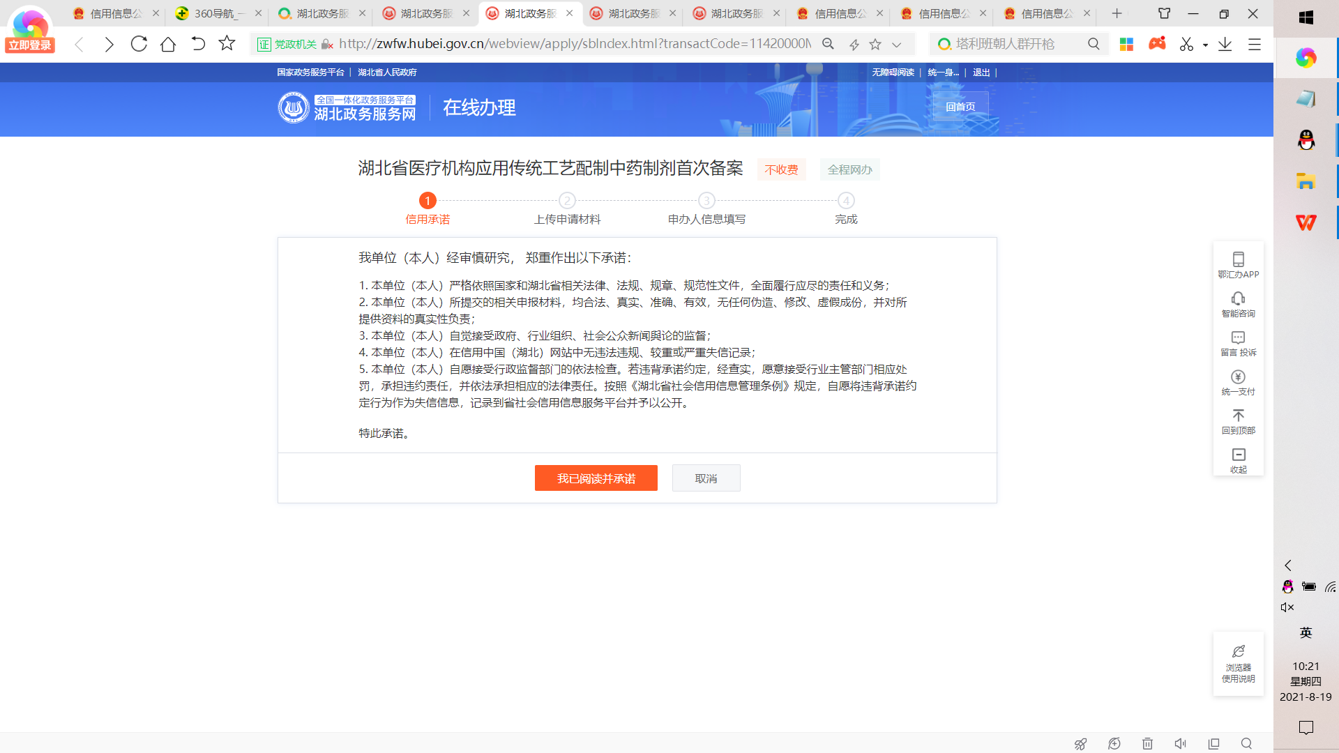 8、点击“湖北省医疗机构应用传统工艺配置重要制剂首次备案”在线办理之后,在线办理页面阅读承诺书,点击“我已阅读并承诺”