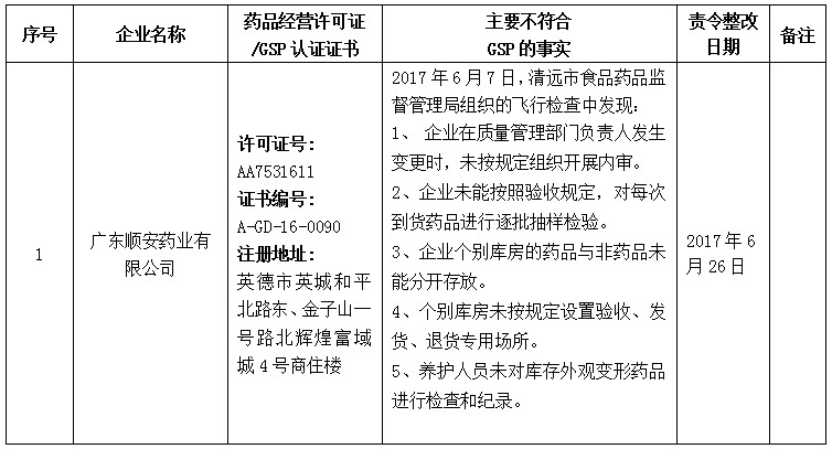 清远市食品药品监督管理局在监督检查中发现,广东顺安药业有限公司不符合《药品经营质量管理规范》规定,市局依据《药品医疗器械飞行检查办法》(国家食品药品监督管理总局令第14号)、《药品经营质量管理规范认证管理办法》等规定,依法责令其限期整改,现予以公布。企业应在责令整改通知下发之日起1个月内完成整改,并向我局报送整改报告并申请复检。