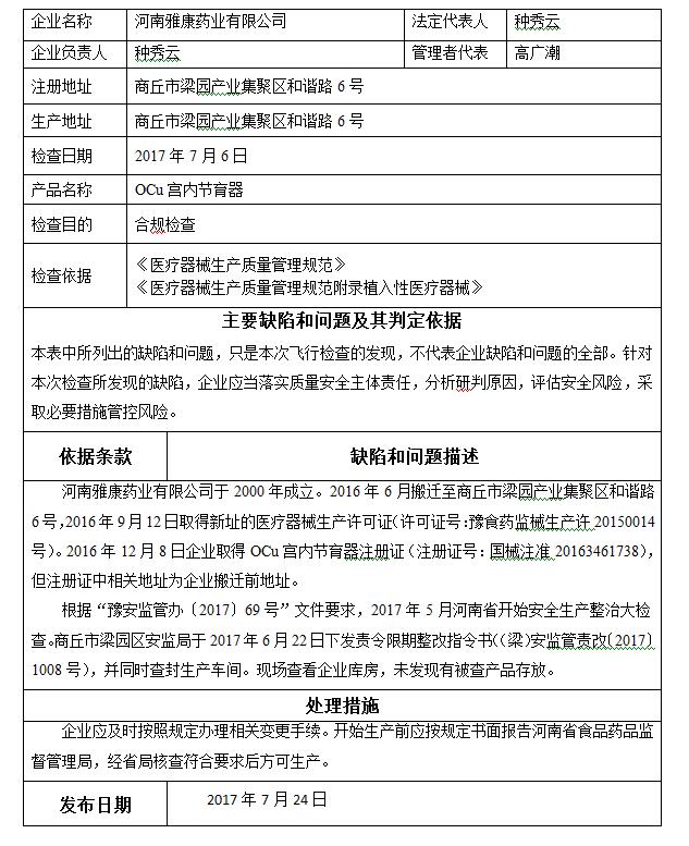对河南雅康药业有限公司飞行检查通报