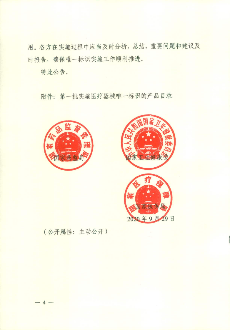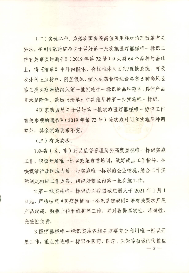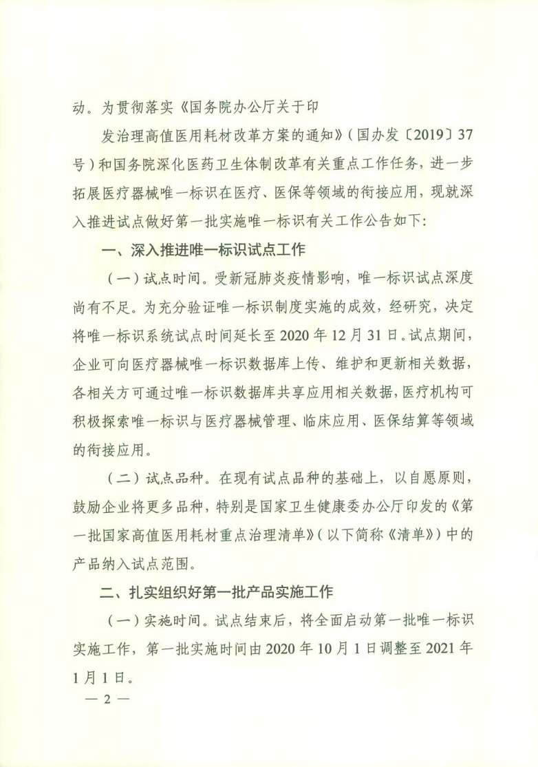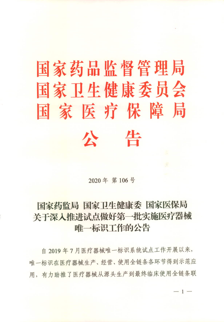 1.国家药监局 国家卫健委 国家医保局关于深入推进试点做好第一批实施唯一标识工作的公告(2020年第106号)