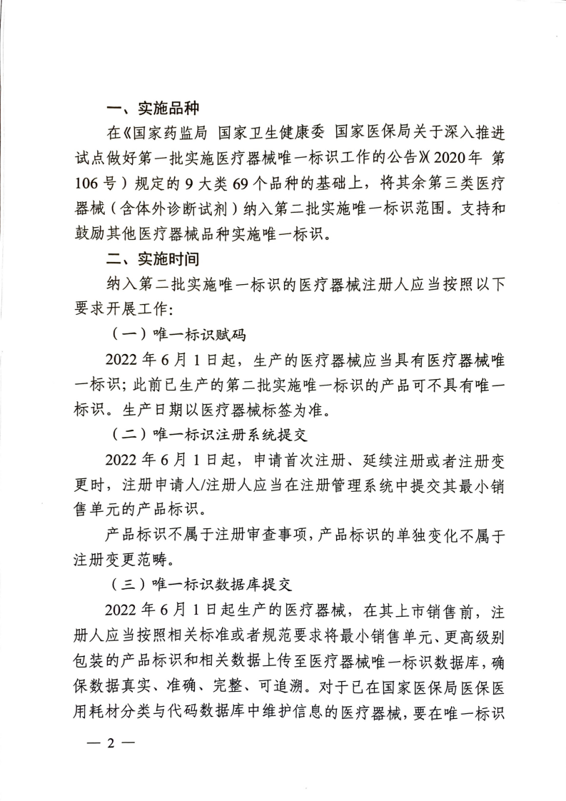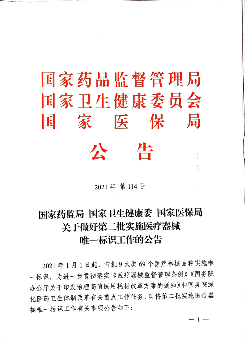 2.国家药监局 国家卫生健康委 国家医保局关于做好第二批实施医疗器械唯一标识工作的公告(2021年第114号)