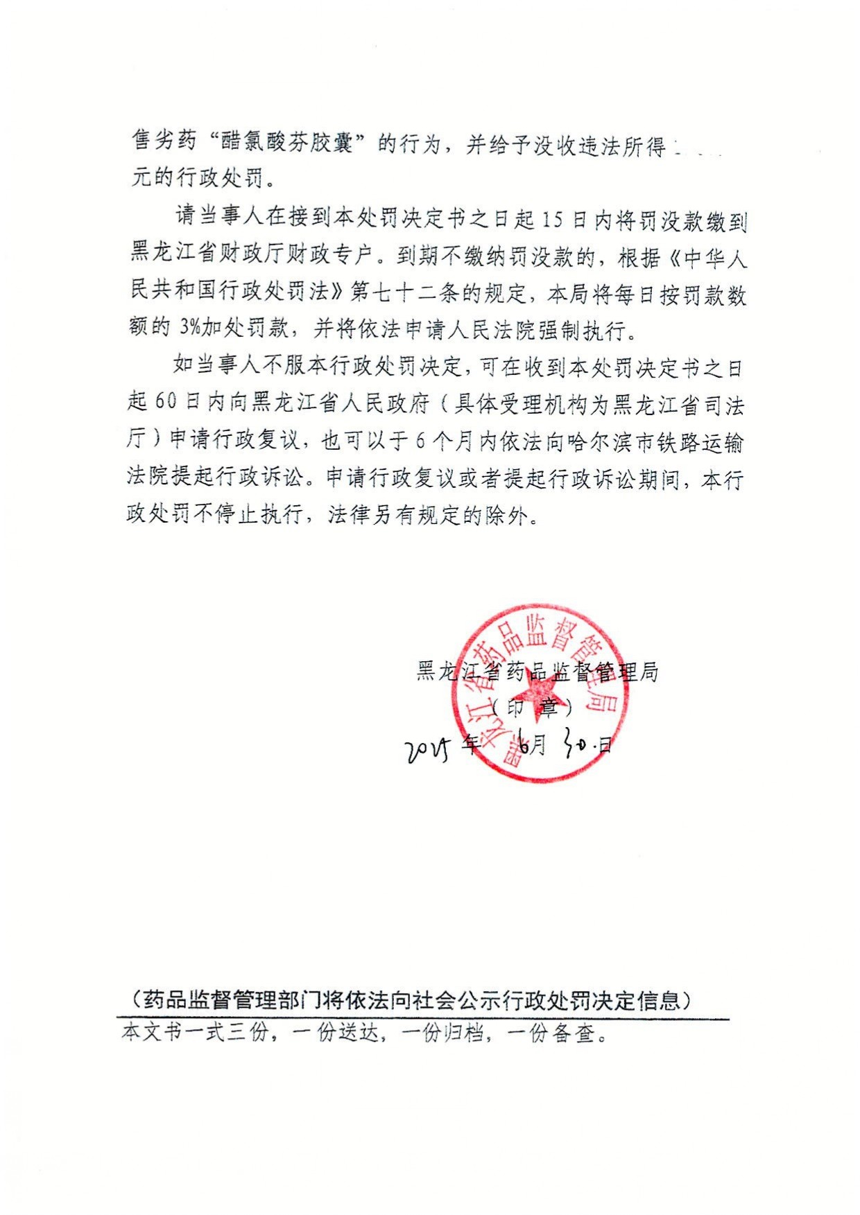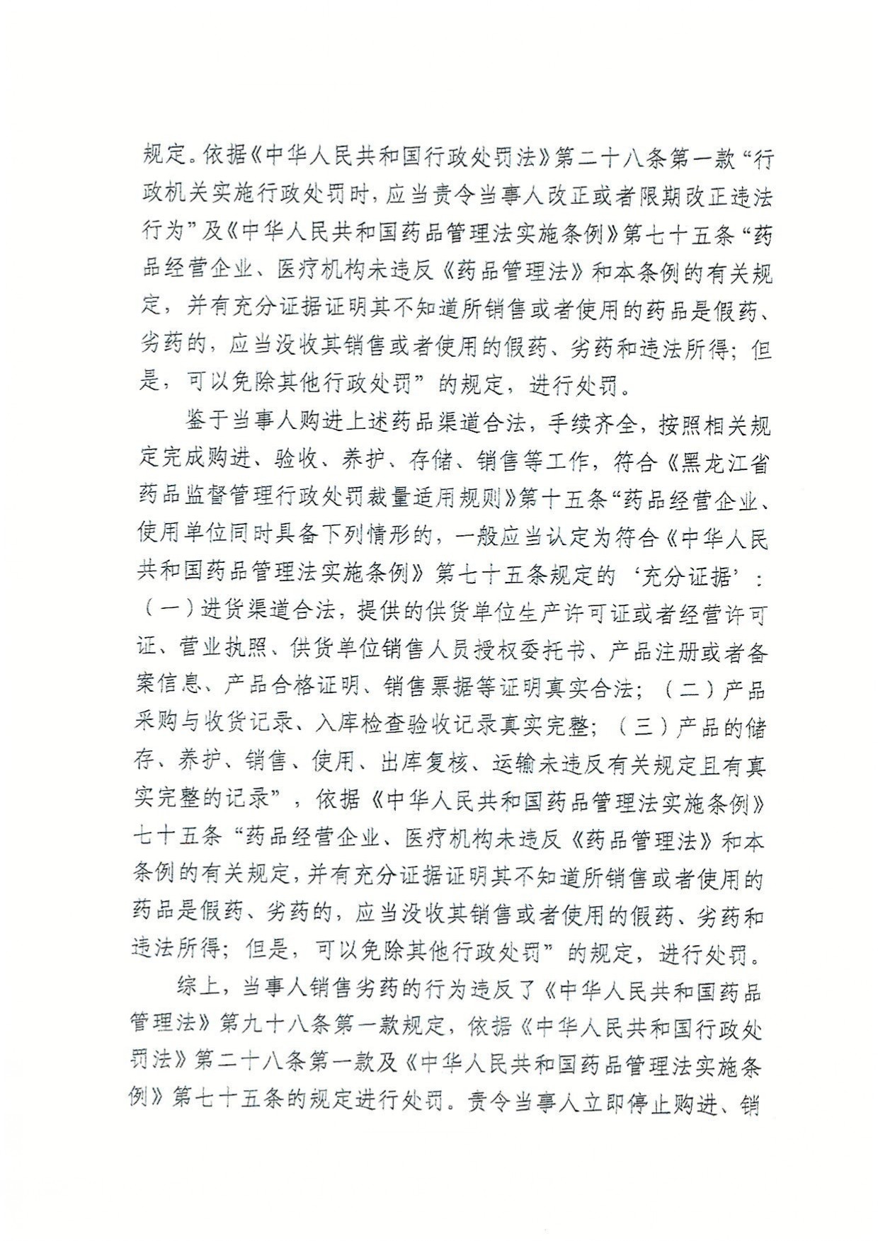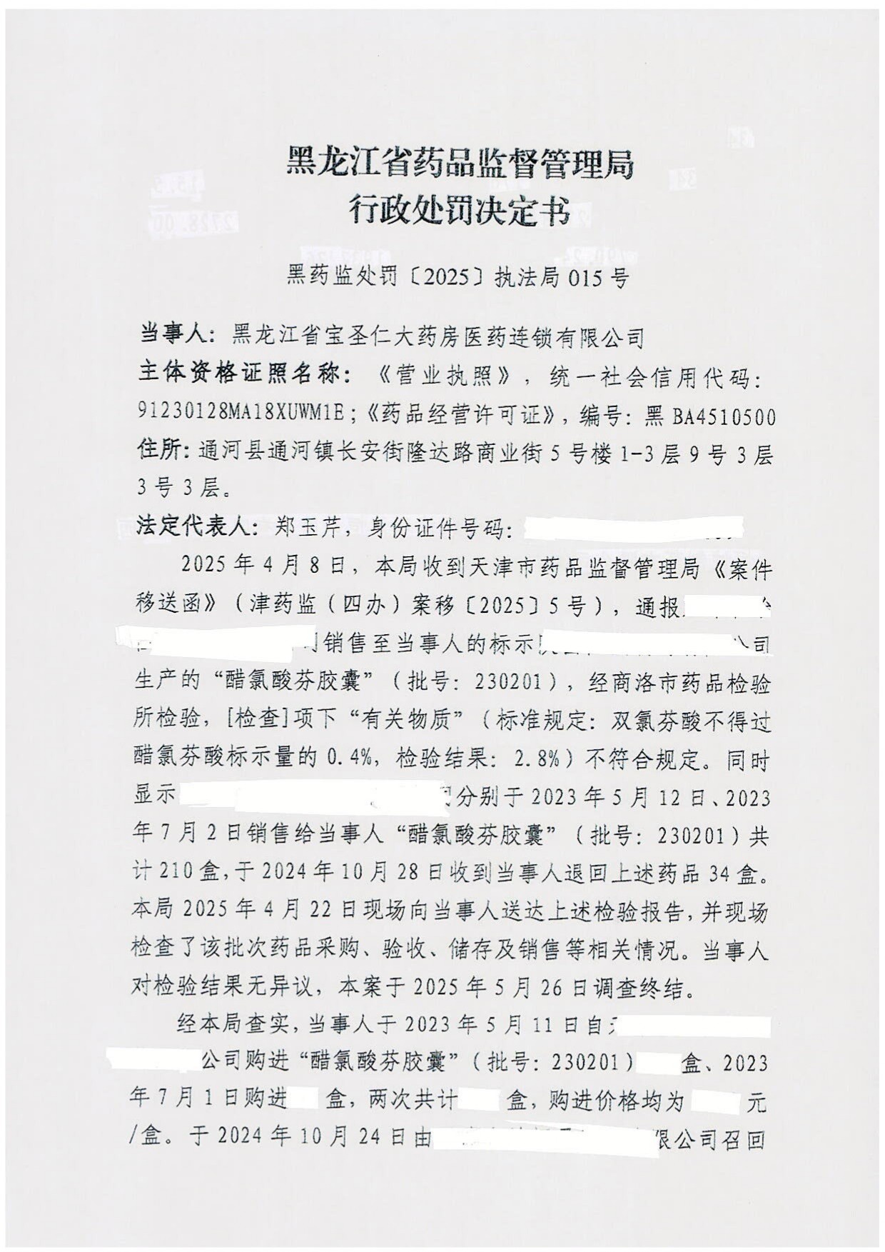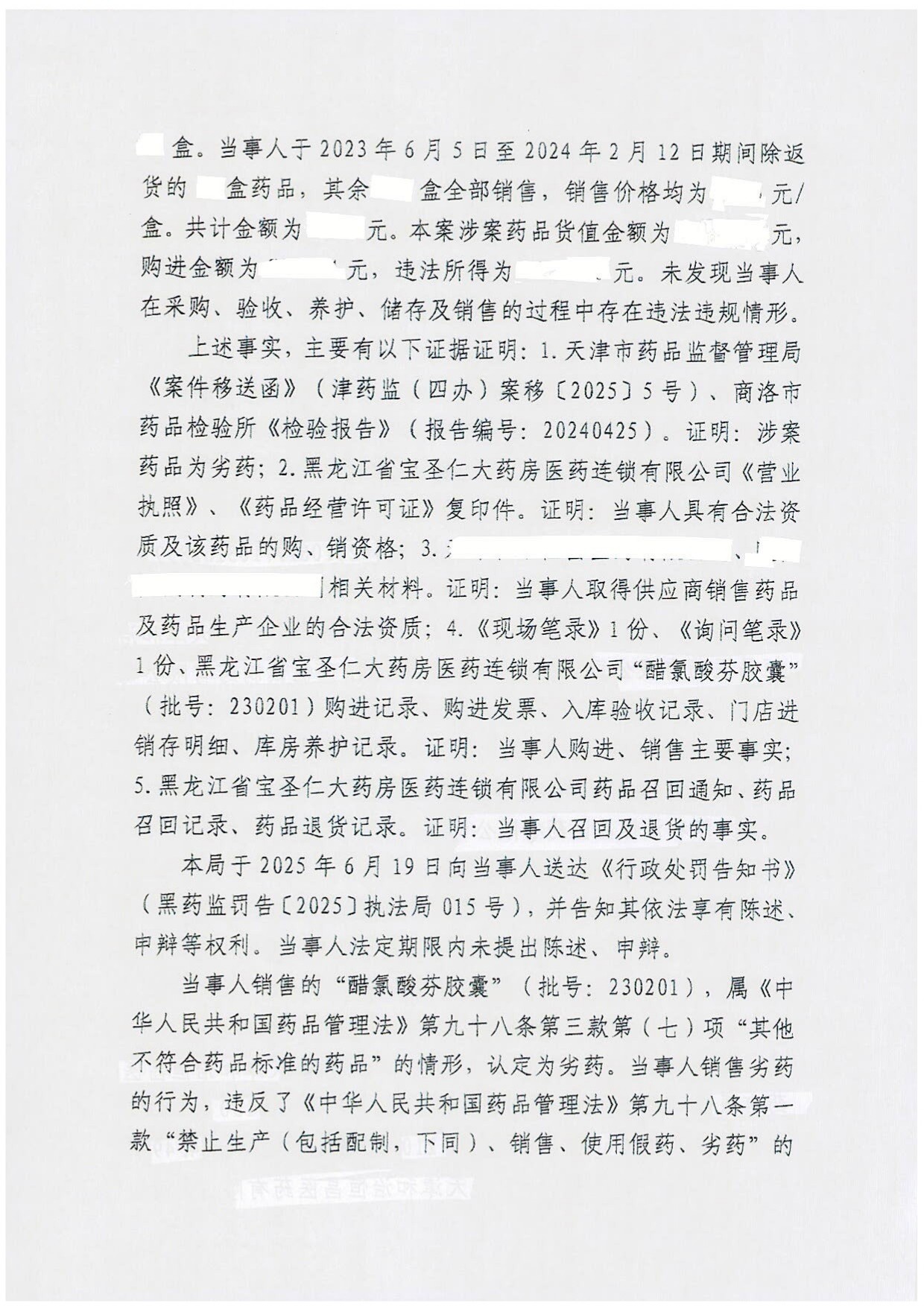 黑龙江省宝圣仁大药房医药连锁有限公司销售劣药“醋氯酸芬胶囊”(批号:230201)的行为违反了《中华人民共和国药品管理法》第九十八条第一款规定,依据《中华人民共和国行政处罚法》第二十八条第一款及《中华人民共和国药品管理法》实施条例第七十五条的规定予以处罚。