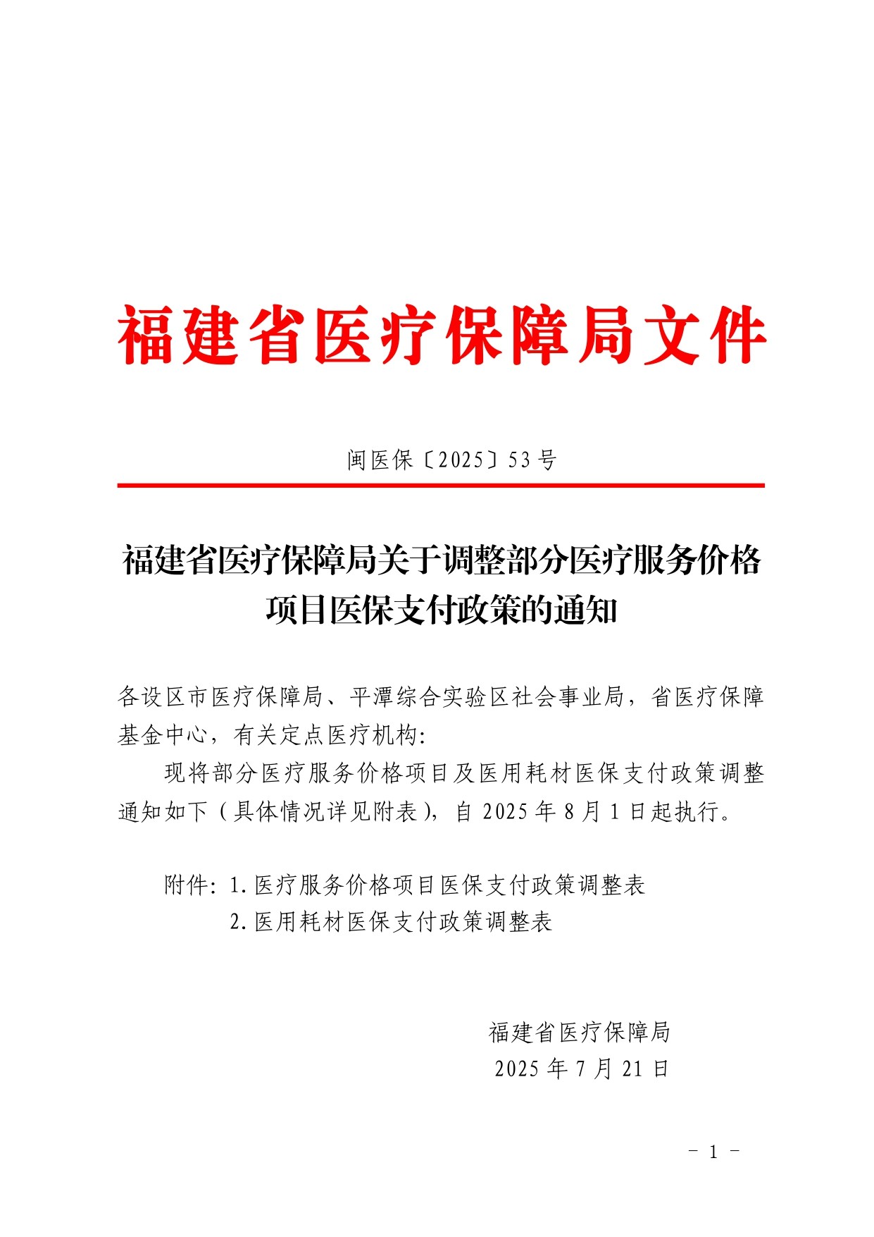 各设区市医疗保障局、平潭综合实验区社会事业局,省医疗保障基金中心,有关定点医疗机构: 现将部分医疗服务价格项目及医用耗材医保支付政策调整通知如下(具体情况详见附表),自2025年8月1日起执行。 附件: 1.医疗服务价格项目医保支付政策调整表 2.医用耗材医保支付政策调整表
