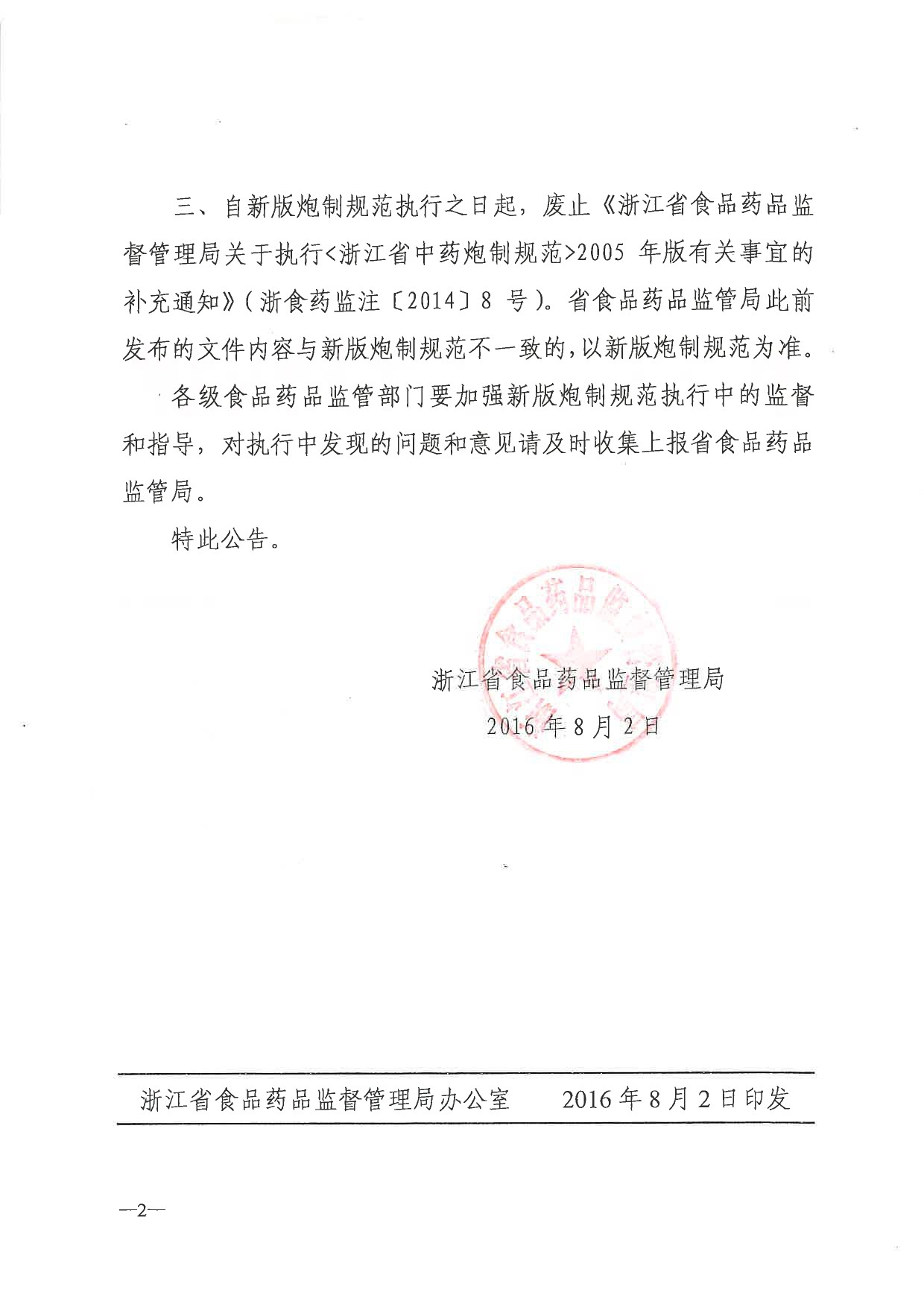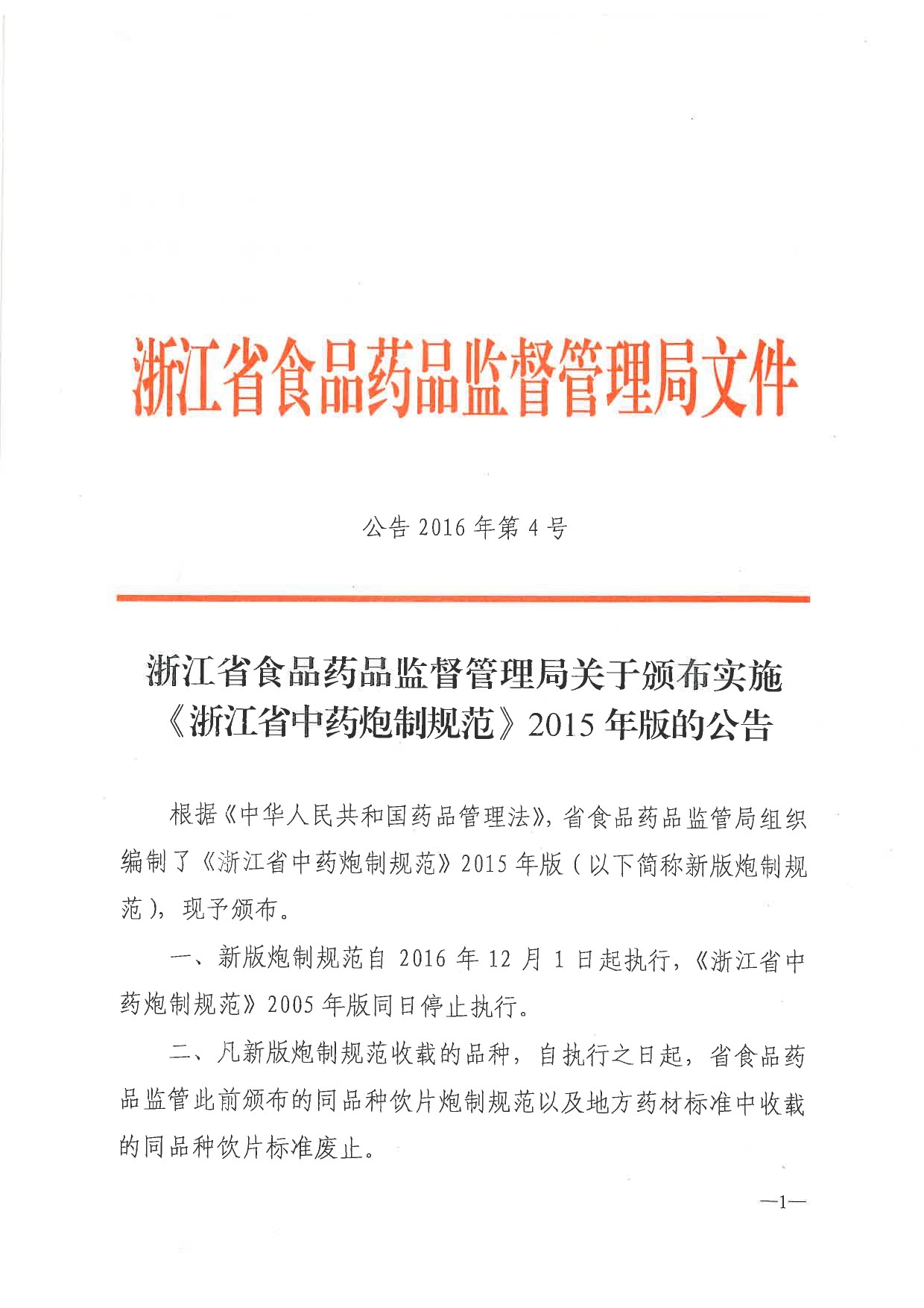 浙江省食品药品监督管理局关于颁布实施《浙江省中药炮制规范》2015年版的公告