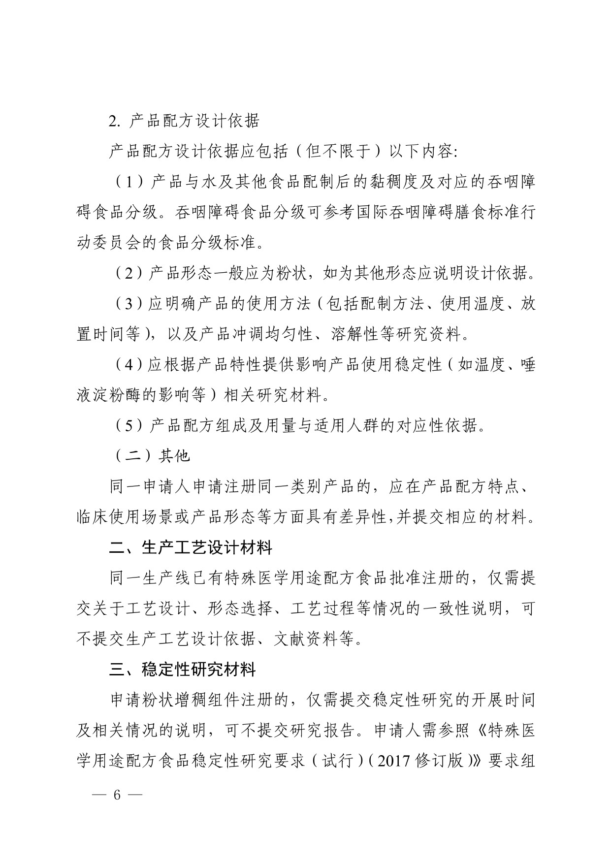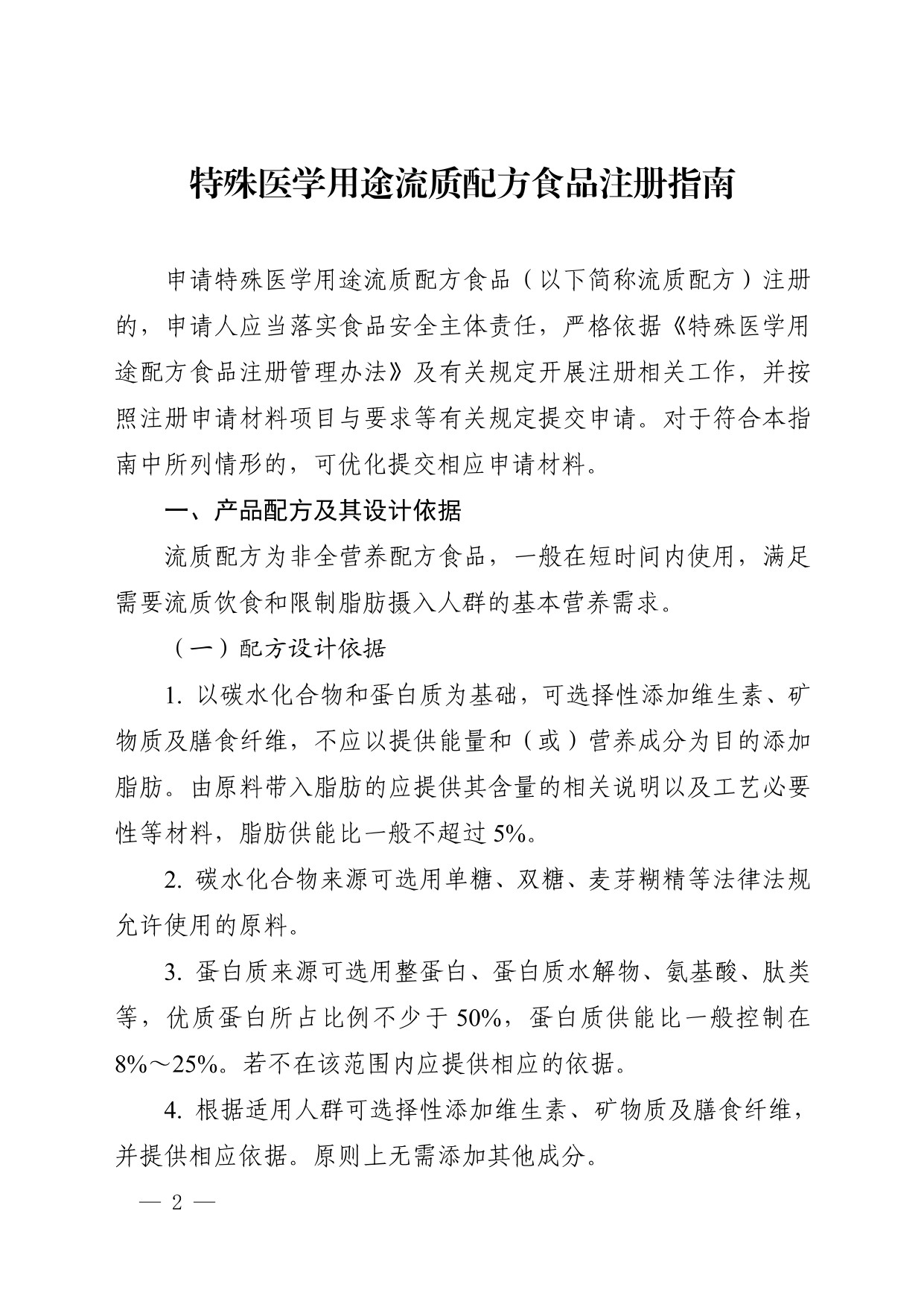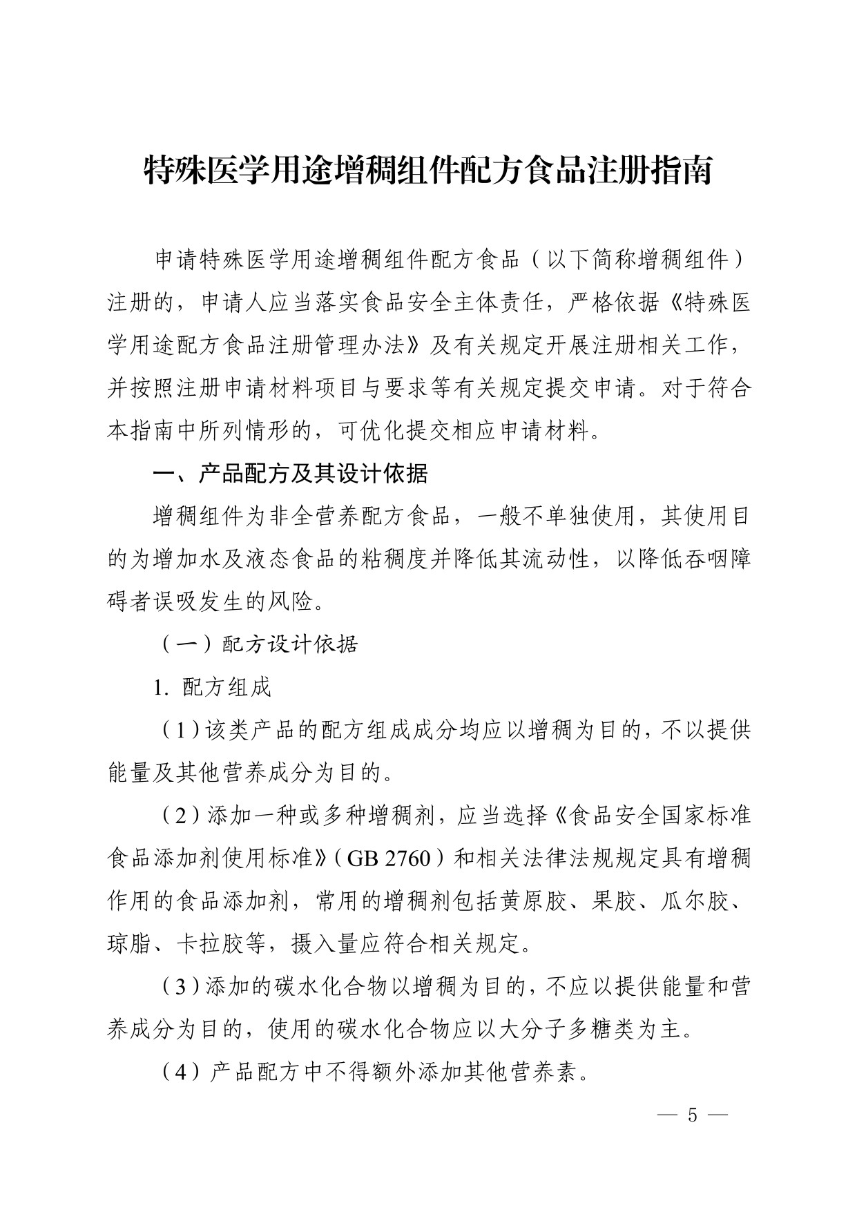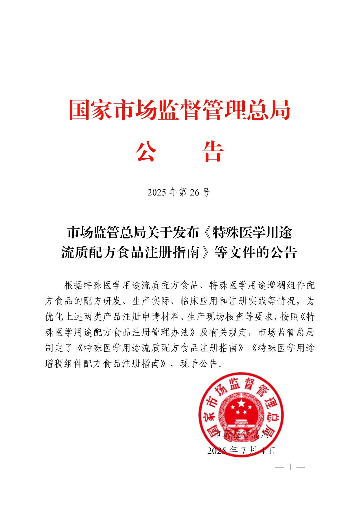 根据特殊医学用途流质配方食品、特殊医学用途增稠组件配方食品的配方研发、生产实际、临床应用和注册实践等情况,为优化上述两类产品注册申请材料、生产现场核查等要求,按照《特殊医学用途配方食品注册管理办法》及有关规定,市场监管总局制定了《特殊医学用途流质配方食品注册指南》《特殊医学用途增稠组件配方食品注册指南》,现予公告。