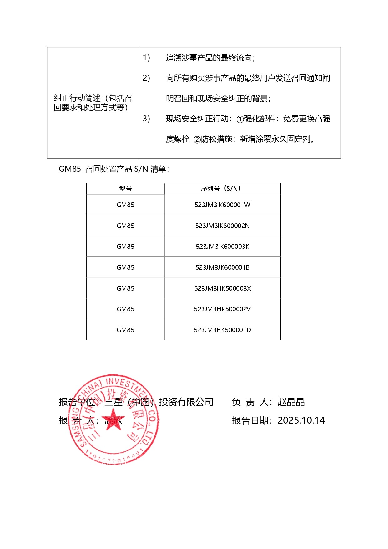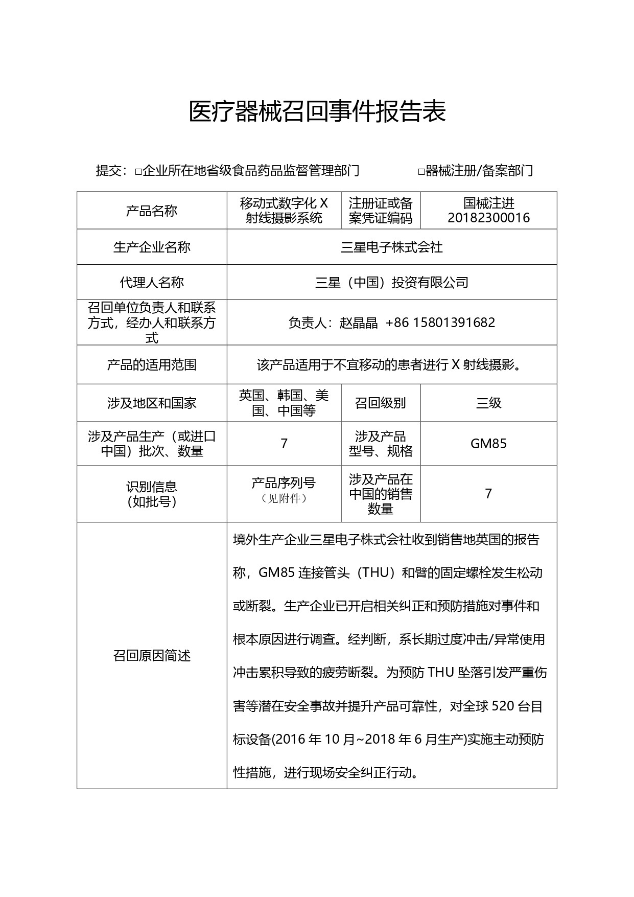报告,由于境外生产企业三星电子株式会社收到销售地英国的报告称,GM85连接管头(THU)和臂的固定螺栓发生松动或断裂。生产企业已开启相关纠正和预防措施对事件和根本原因进行调查。经判断,系长期过度冲击/异常使用冲击累积导致的疲劳断裂。为预防THU坠落引发严重伤害等潜在安全事故并提升产品可靠性,对全球520台目标设备(2016年10月~2018年6月生产)实施主动预防性措施,进行现场安全纠正行动。等原因,三星(中国)投资有限公司对其生产的移动式数字化X射线摄影系统(注册或备案号:国械注进20182300016 )主动召回。召回级别为三级。涉及产品的型号、规格及批次等详细信息见《医疗器械召回事件报告表》。