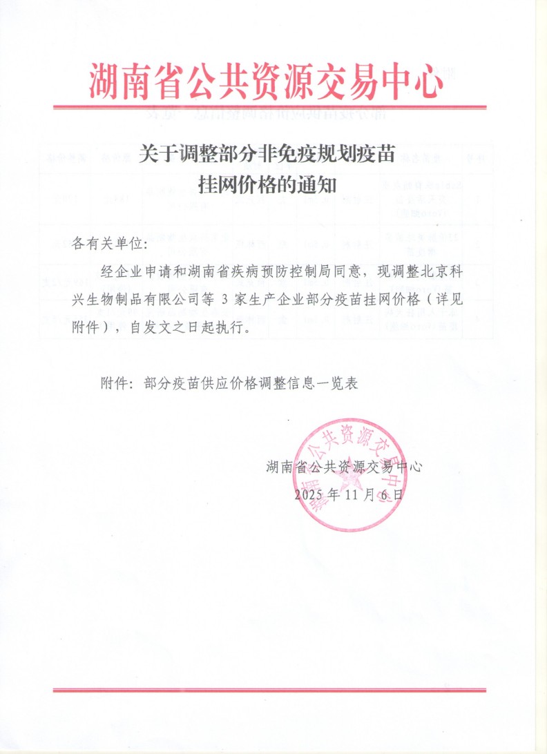 湖南关于调整部分非免疫规划疫苗挂网价格的通知