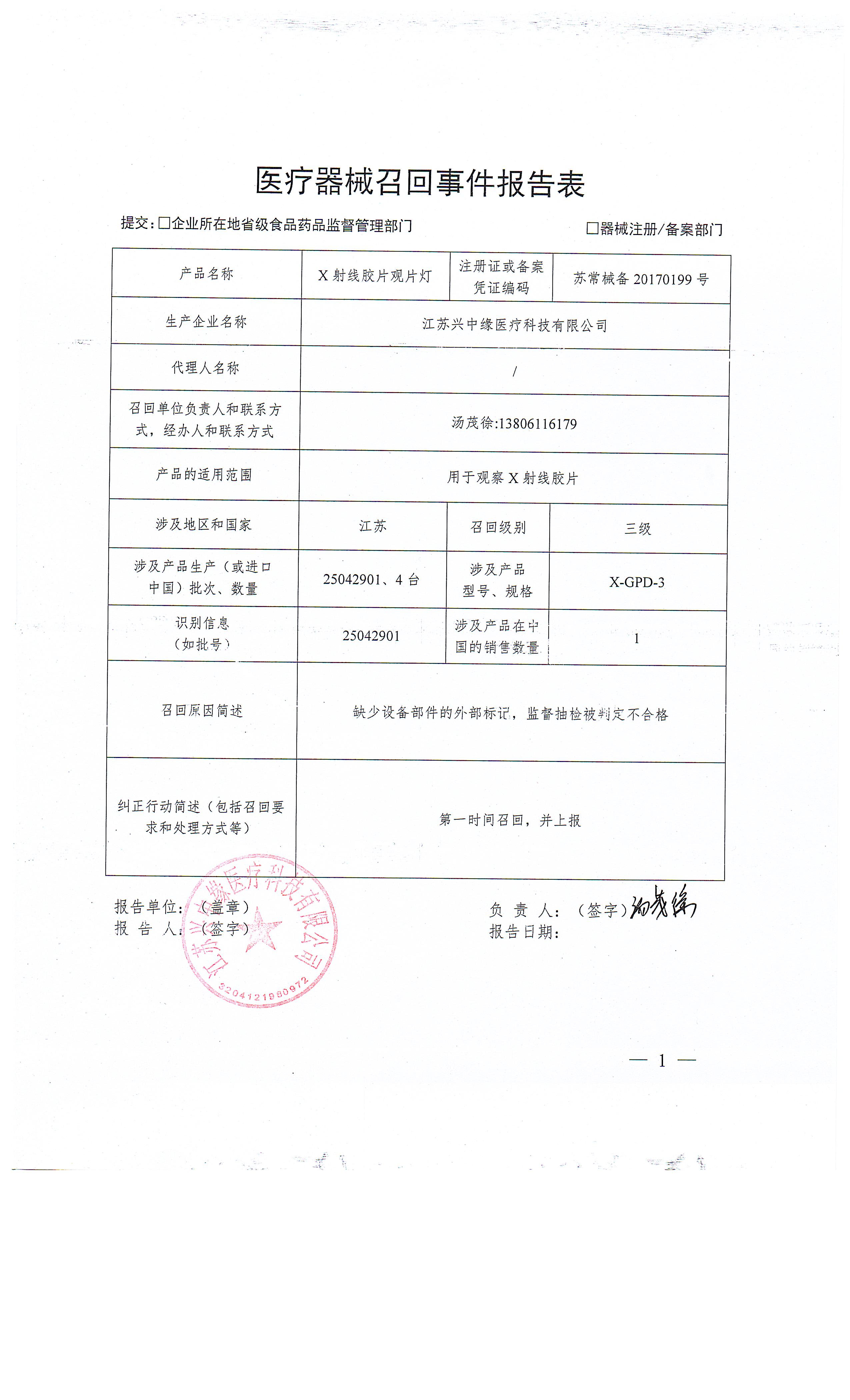 江苏兴中缘医疗科技有限公司报告,由于在监督抽检中出现缺少设备部件的外部标记的问题,江苏兴中缘医疗科技有限公司对其生产的X射线胶片观片灯主动召回。召回级别为三级。涉及产品的型号、规格及批次等详细信息见《医疗器械召回事件报告表》。
