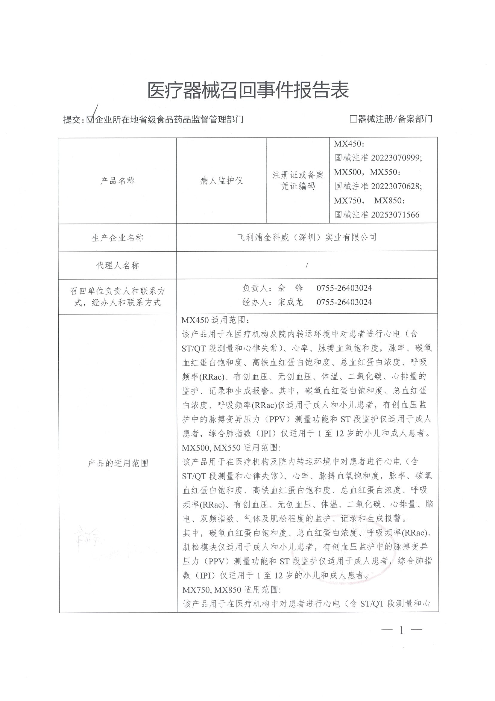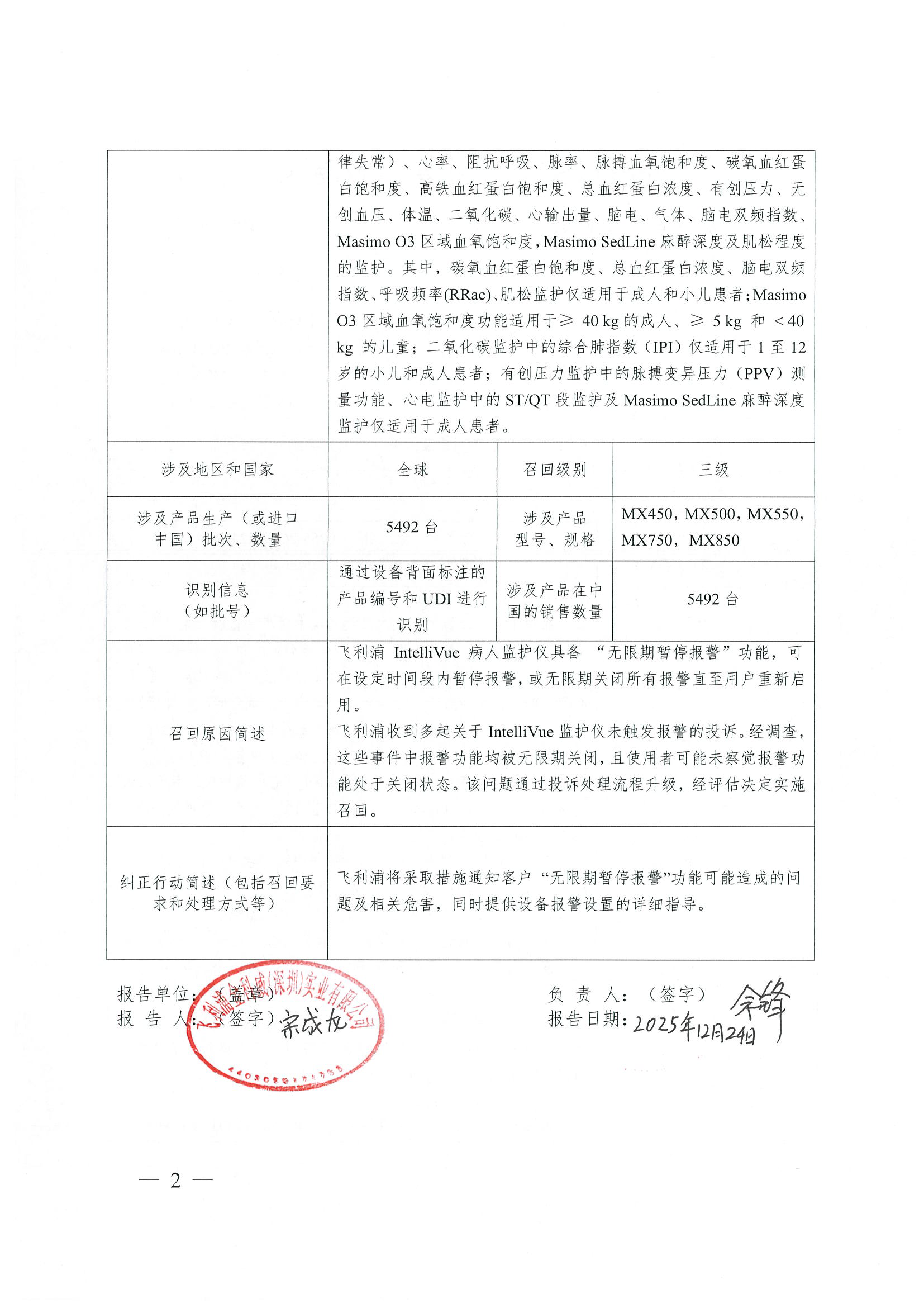 经调查,这些事件中报警功能均被无限期关闭,且使用者可能未察觉报警功能处于关闭状态。该问题通过投诉处理流程升级,经评估决定实施召回。飞利浦金科威(深圳)实业有限公司对病人监护仪(注册证号:MX450:国械注准20223070999;MX500,MX550:国械注准20223070628;MX750, MX850:国械注准20253071566)主动召回,召回级别为三级。涉及产品的型号、规格及批次等详细信息见《医疗器械召回事件报告表》。