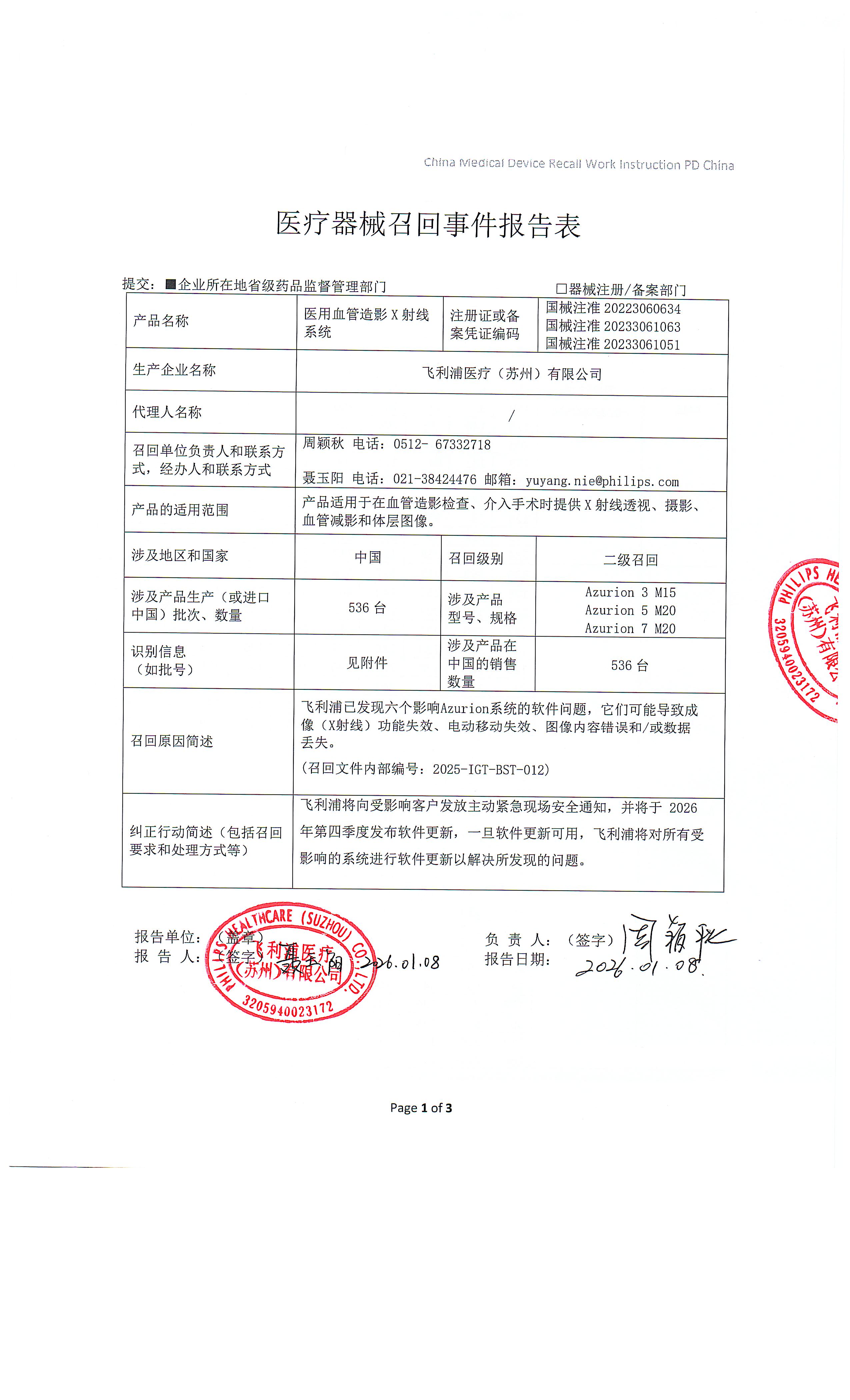 飞利浦医疗(苏州)有限公司报告,由于发现可能导致成像系统功能失效、电动移动失效、图像内容错误或数据丢失等六个影响Azurion系统的软件问题,飞利浦医疗(苏州)有限公司对其生产的医用血管造影X射线系统主动召回。召回级别为二级。涉及产品的型号、规格及批次等详细信息见《医疗器械召回事件报告表》。