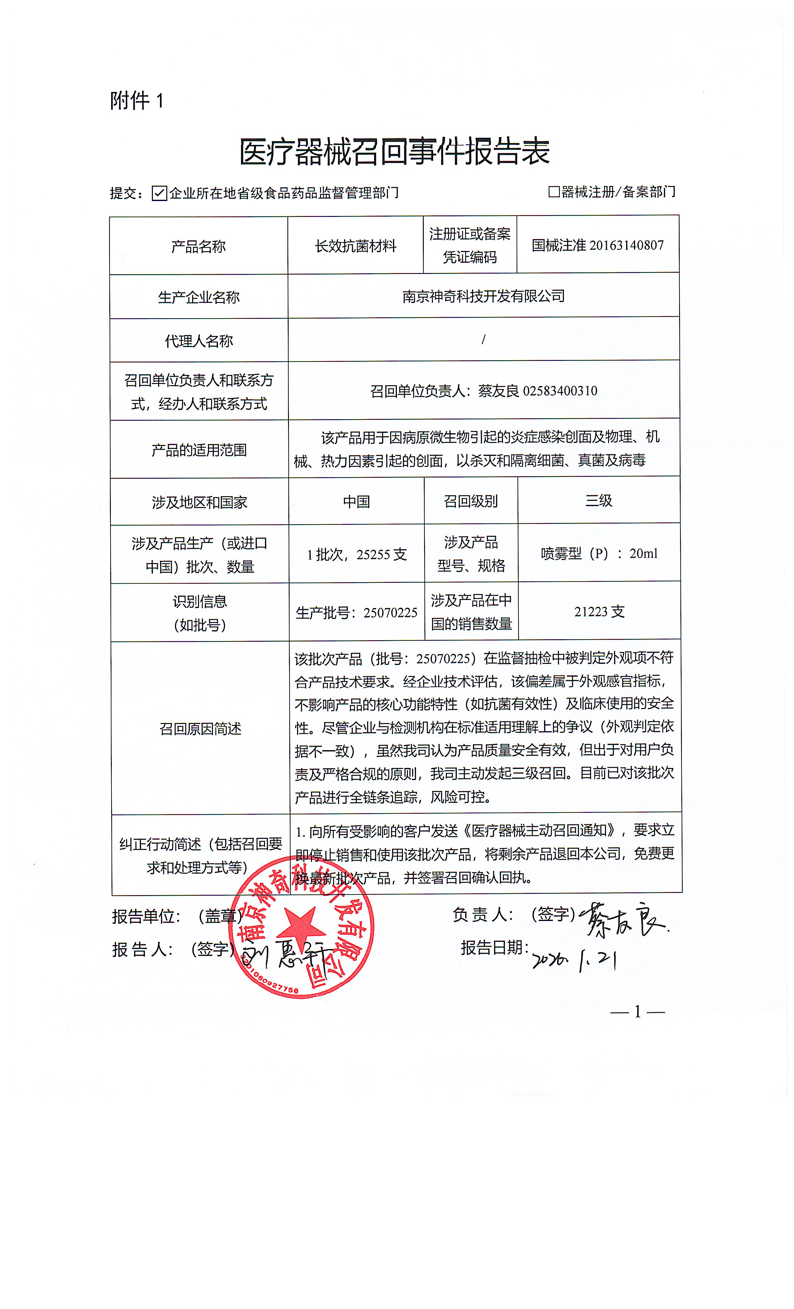 南京神奇科技开发有限公司报告,由于在江苏省局监督抽检中出现外观不符合要求的原因, 南京神奇科技开发有限公司对其生产的长效抗菌材料主动召回。召回级别为三级。涉及产品的型号、规格及批次等详细信息见《医疗器械召回事件报告表》。