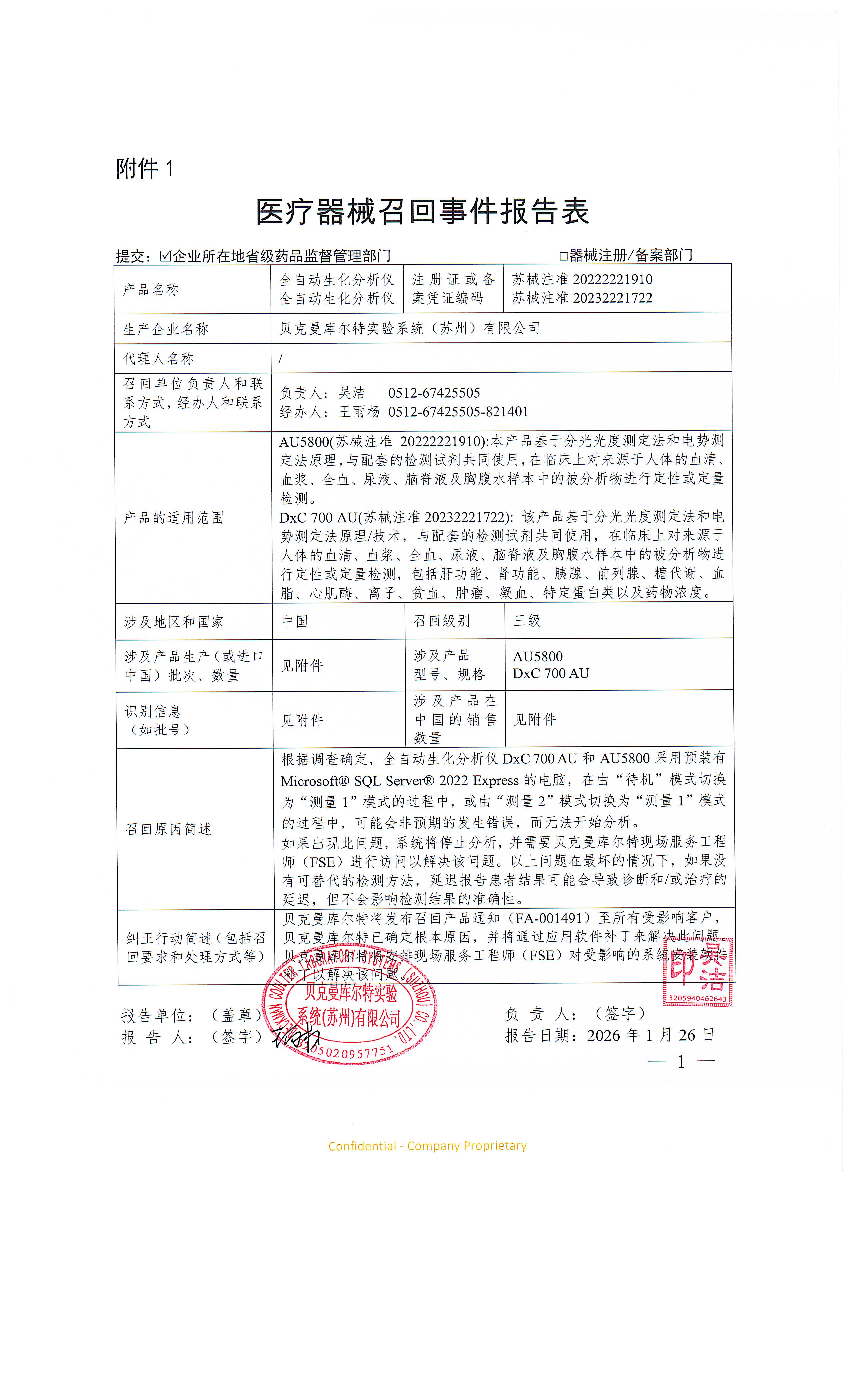 贝克曼库尔特实验系统(苏州)有限公司报告,由于电脑在模式切换过程中,可能出现非预期错误,导致无法开始分析的原因,贝克曼库尔特实验系统(苏州)有限公司对其生产的全自动生化分析仪主动召回。召回级别为三级。涉及产品的型号、规格及批次等详细信息见《医疗器械召回事件报告表》。